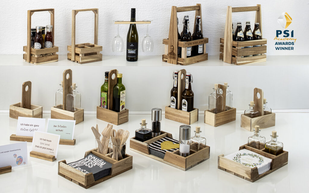 So wurden von unseren Holzfachleuten Getränketräger, Servierbretter, Schlüsselbretter und Flaschenaufsätze entworfen und produziert. Durch die Möglichkeit, mit unseren Lasersystemen individuelle Werbebotschaften, Logos und Grafiken aufzubringen, sind die Artikel natürlich besonders für die Werbeartikelbranche von Bedeutung.